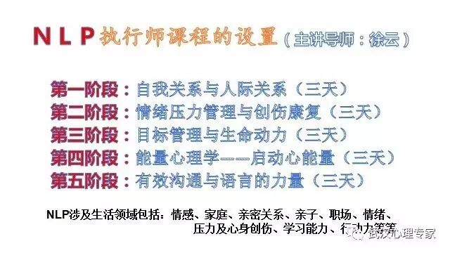 同时,徐云博士是NLP执行师、NLP培训师,NLP国际导师,华中科技大学同济心理卫生研究中心职业培训办主任,美国催眠治疗师评审委员会A.C.H.E.临床催眠治疗师,高级心理咨询师,国际海灵格科学院注册系统排列导师,国际AHMI\AAH催眠训练师,北京师范大学心理学博士研究生,国家认证一级培训师。