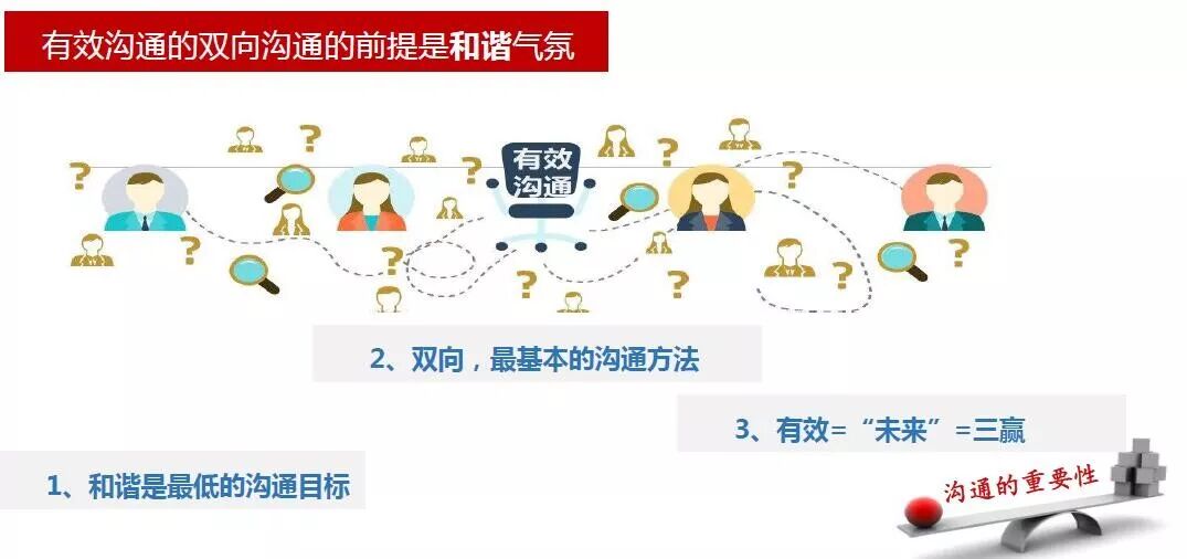 有效沟通是人际间双向沟通,前提是和谐气氛。沟通的和谐气氛是一切的前提,同时,和谐是智商和情商的一个面向,是彼此的相互尊重与敬意。